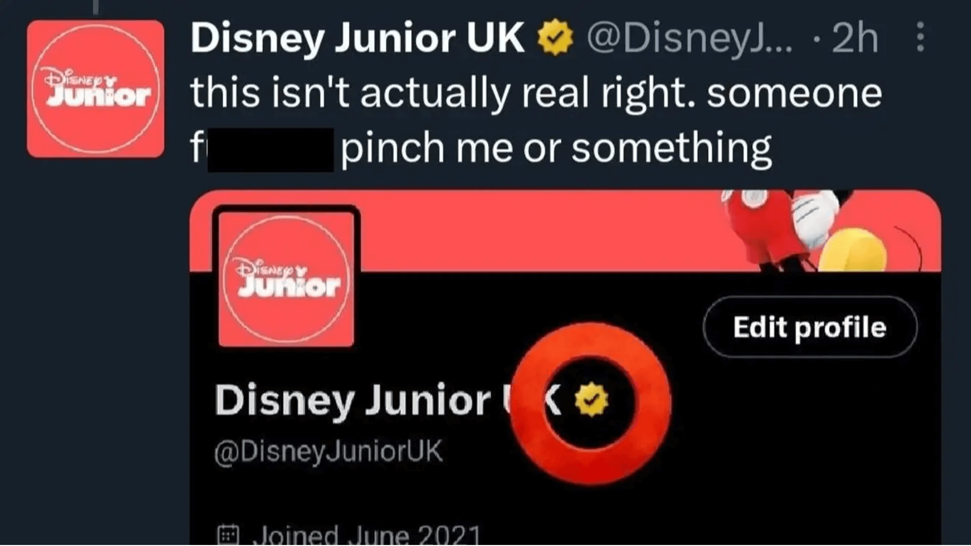 «Esto no es realmente correcto. Alguien me pellizcó o algo así», fue el texto con el que alertó a sus seguidores. Luego, la publicación se hizo viral. Todo ello sucedió mientras que la “real” cuenta de Disney Junior ya contaba con una insignia dorada.