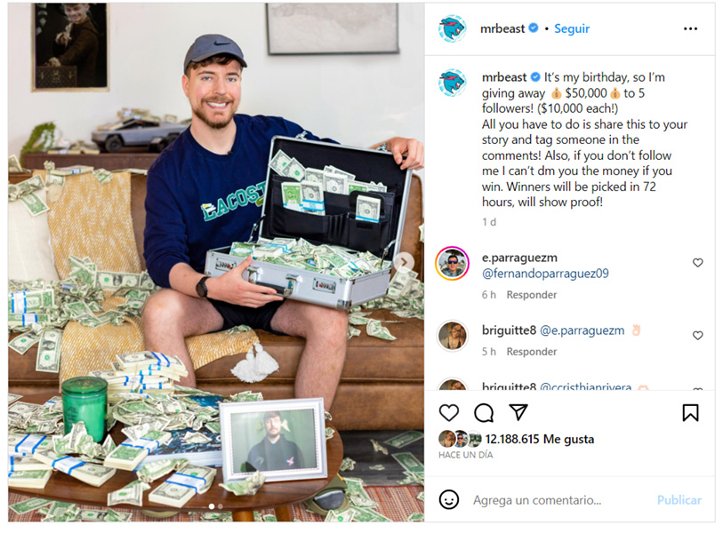 A través de una publicación en su cuenta de Instagram, MrBeast dio a conocer los detalles del concurso en que regala miles de dólares a sus seguidores. «¡Es mi cumpleaños, así que estoy regalando US$ 50,000 a 5 seguidores! (¡US$ 10.000 cada uno!) Todo lo que tienes que hacer es compartir esto a tu historia y etiquetar a alguien en los comentarios! Además, si no me sigues no podré enviarte el dinero por dm si ganas. ¡Los ganadores serán elegidos en 72 horas, se mostrará la prueba!», comentó.