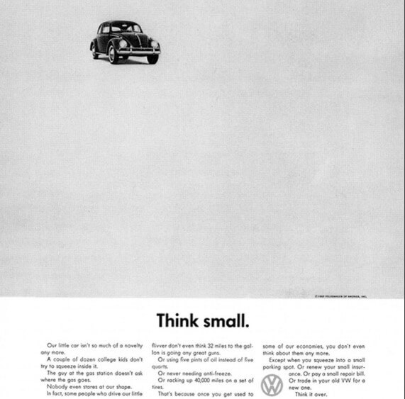 En un mercado dominado autos grandes, este aviso irrumpía, con irreverencia, de manera valiente. Después de la Segunda Guerra Mundial, ¡un creativo judío lanza un carro alemán en Estados Unidos! Fue un éxito.