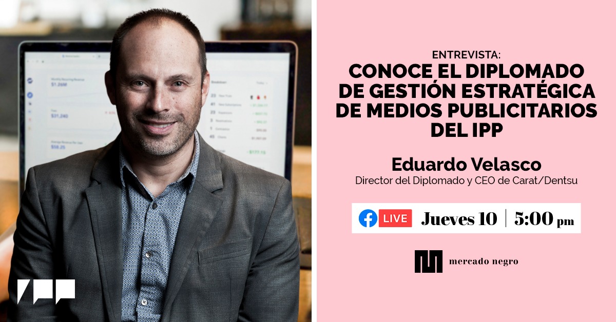 Mercado Negro presenta este Jueves 10 de Septiembre a las 5:00 pm una entrevista a Eduardo Velasco, Director del Diplomado de Gestión Estratégica de Medios Publicitarios del IPP, Gerente General de Carat y Presidente de la Asociación de Agencia de Medios del Perú, donde explica el objetivo del diplomado, los módulos y sobre la experiencia de los docentes que lo dictarán. Este diplomado inicia el 22 de septiembre, vía Online.