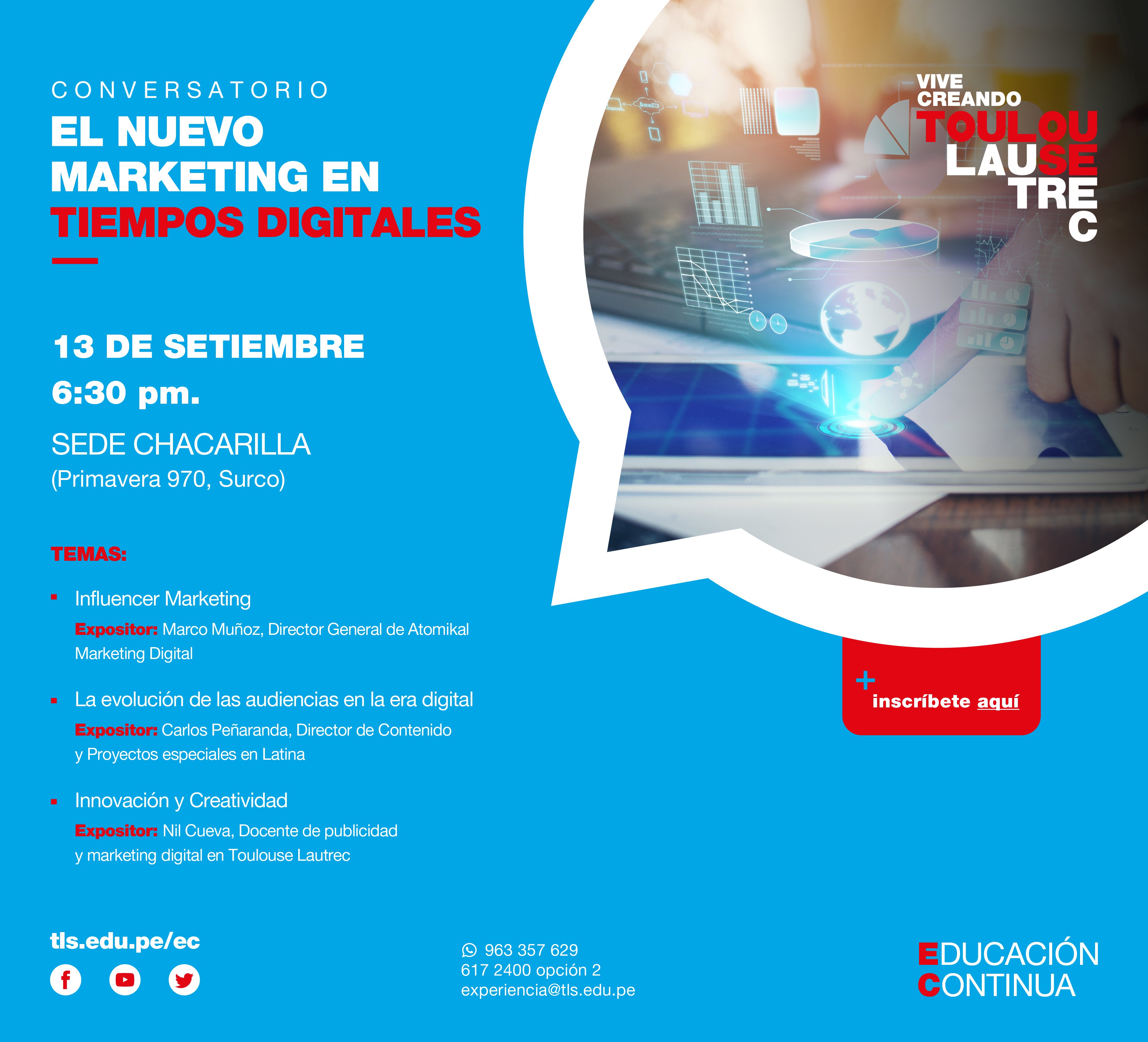 Toulouse Lautrec y Mercado Negro presentan el taller vivencial: El Nuevo Marketing en Tiempos Digitales en donde en un conversatorio 3 expertos compartirán sus experiencias con el marketing en la era digital.