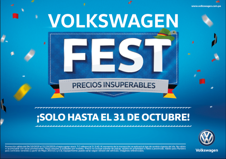 Para brindar la oportunidad a todos los peruanos de obtener un auto nuevo a un precio insuperable, el fabricante alemán realiza el Volkswagen Fest, campaña que se lleva a cabo durante todo el mes de octubre en sus 24 concesionarios a nivel nacional. Además, ofrece descuentos súper especiales brindando la posibilidad de adquirir un vehículo con el sello de Volkswagen desde $ 11,590.