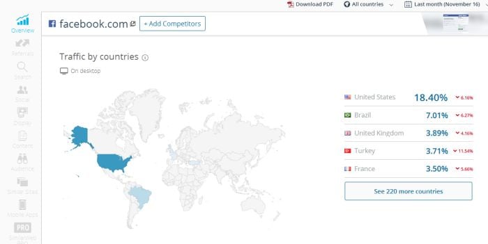 SimilarWeb al parecer no se queda en la típica información que sueles encontrar con Google Analytics, sino que puedes hacer comparación de los datos con la competencia y puedes ver los de tu competencia. De alguna forma este paneo encenderá las alarmas o te inspirará si de buenos resultados se trata.