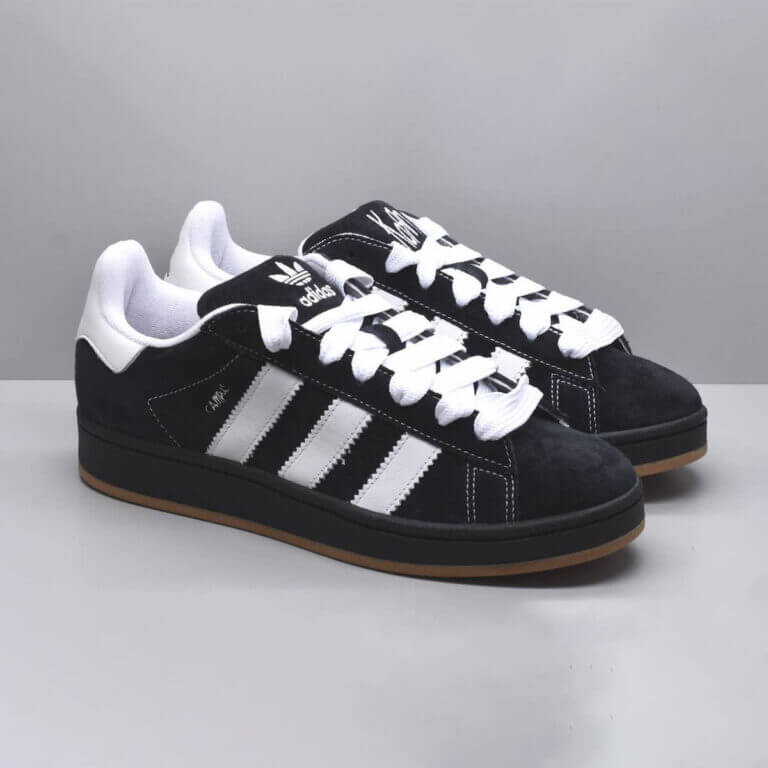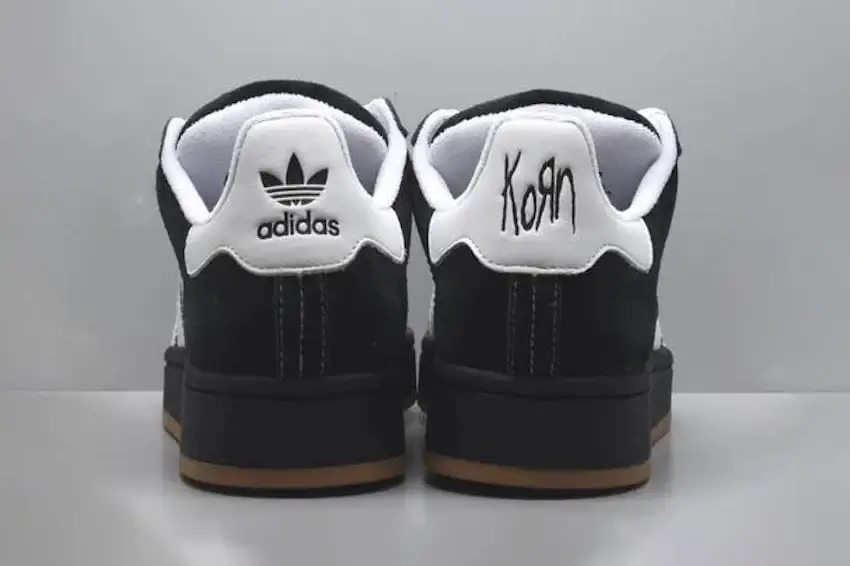 Para las Korn x adidas Campus 00s, la pareja opta por un conjunto predominantemente negro con un blanco contrastante que llega al perfil de las Tres Rayas, cordones gruesos, tacones y forro interior. El par se eleva aún más con la marca «Korn» en la lengüeta derecha, un llavero con púa de guitarra y una obra de arte extraída del famoso álbum Life is Peachy de la banda en las plantillas.