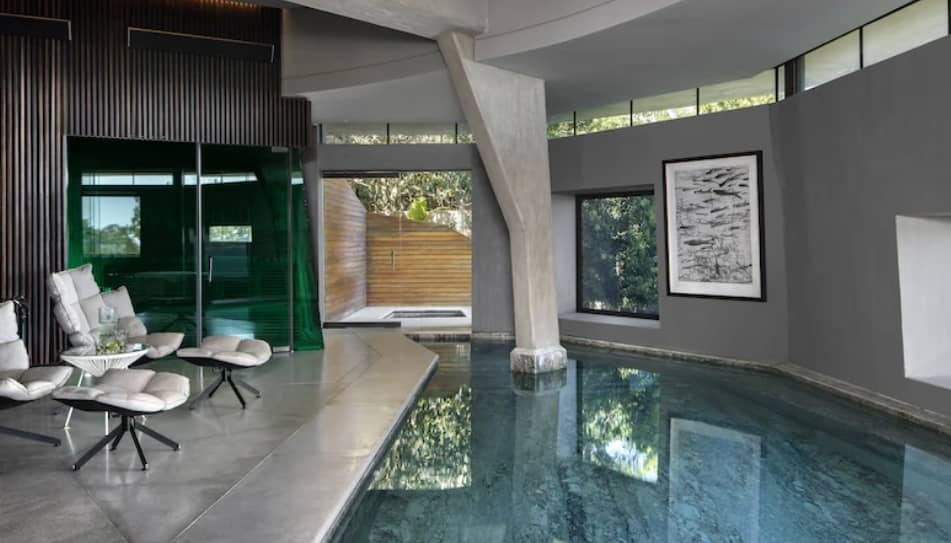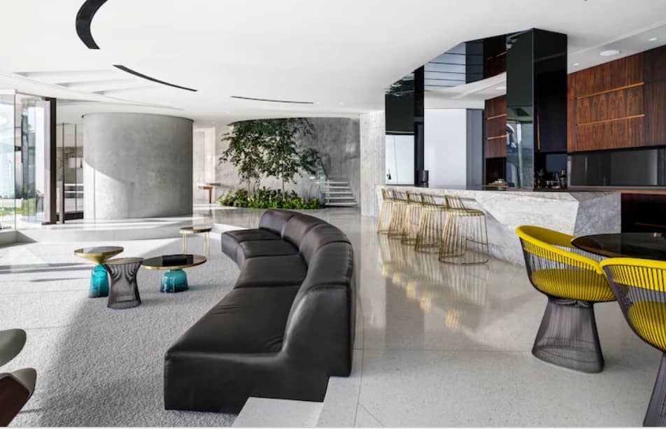 Además, hay dos ascensores y un pasaje con piso de vidrio para conectar todas las secciones. Los niveles inferiores cuentan con un gran garaje, una piscina cubierta y una oficina. Mientras que los niveles superiores tienen dos espacios de entretenimiento en forma de disco con ventanas de vidrio inclinado. Este último es ideal para dar fiestas privadas al estilo Tony Stark, ubicando a cincuenta invitados con facilidad y con un bar completamente abastecido a disposición.