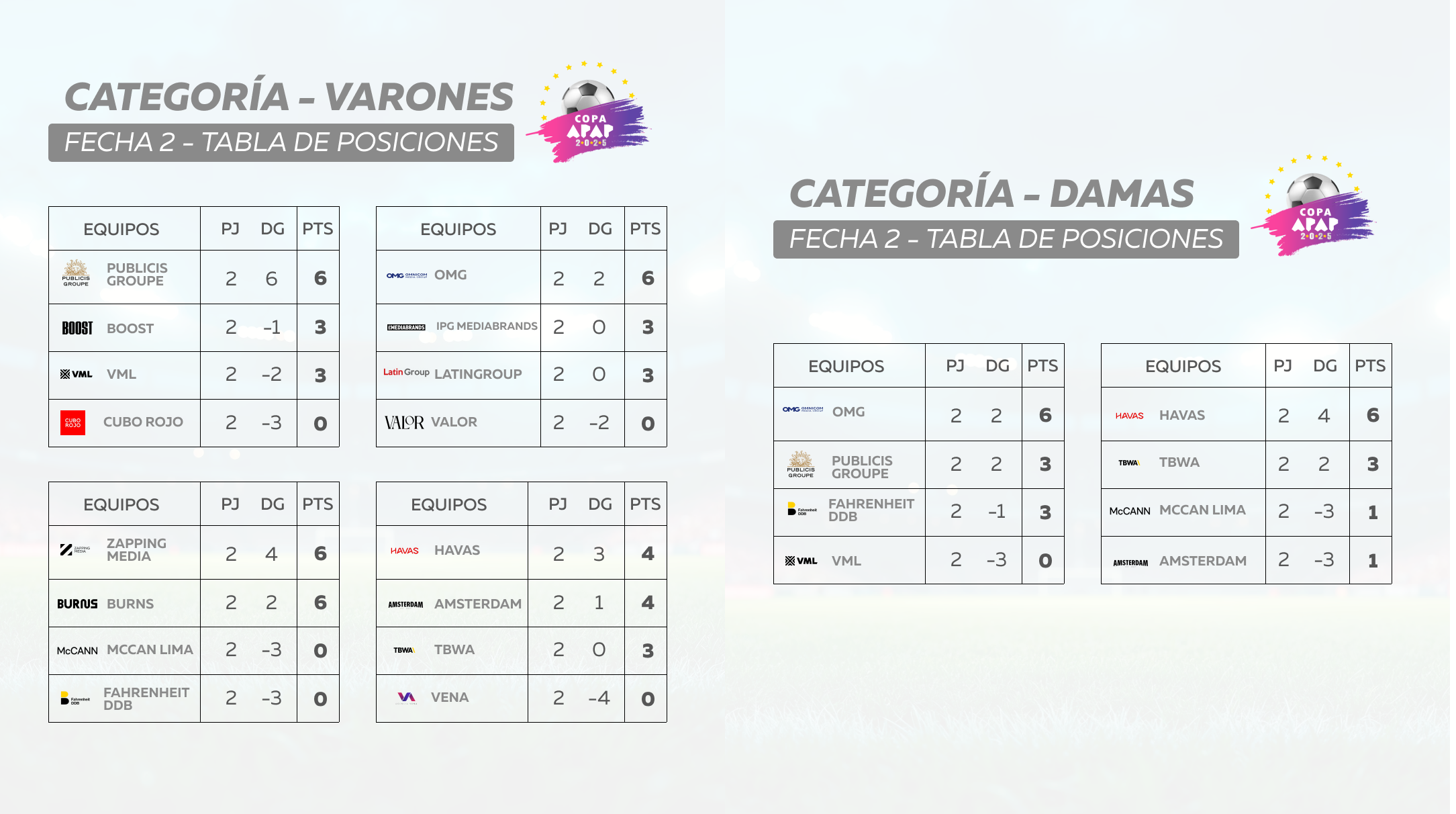 Por su parte, en la competencia masculina, Havas llegó a los cuatro puntos en la tabla, al igual que Amsterdam. VML y LatinGroup acumularon primer partido ganado y, en paralelo, Burns, OMG, Zapping Media y Publicis lograron su segunda victoria.