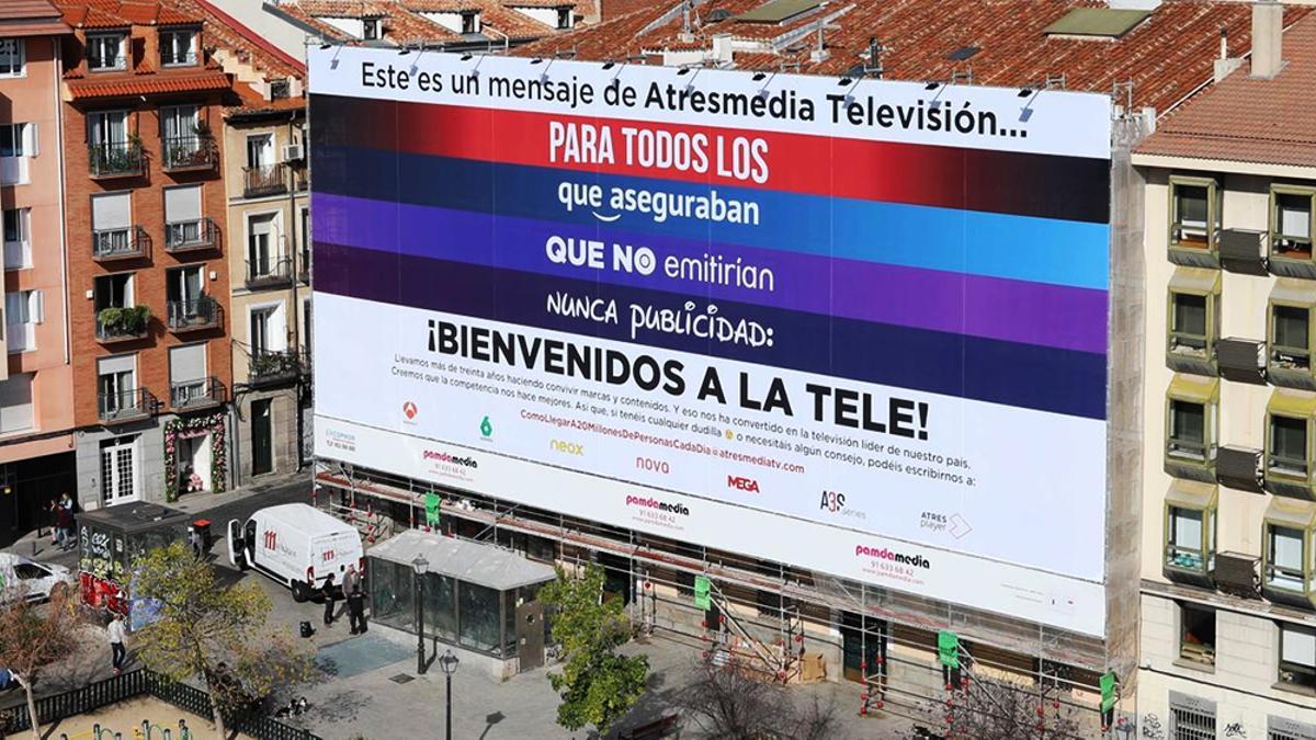 Las publicidades nunca dejan de sorprender. Esta vez sucedió en Madrid, que despertó este 7 de noviembre con una imagen en una fachada de sus calles. Una campaña promovida por Atresmedia y dirigida a las plataformas de streaming ante sus planes de poner en marcha suscripciones más económicas con publicidad incluida.