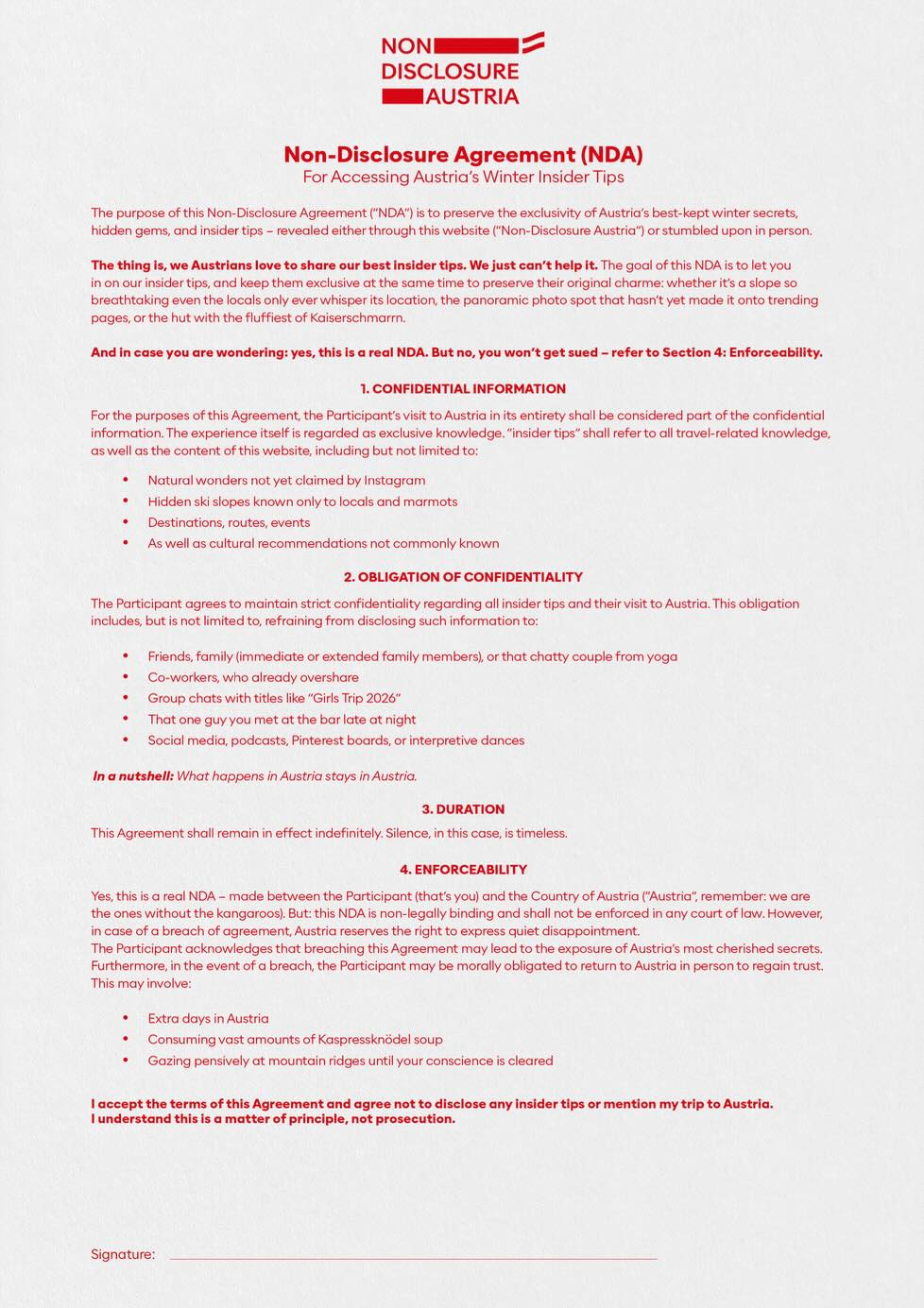 Bajo el nombre «Non Disclosure Austria», la iniciativa desarrollada junto a la agencia Wien Nord Serviceplan toma como referencia los acuerdos de confidencialidad del mundo empresarial. Además, la campaña invita a los turistas a firmar un compromiso simbólico antes de acceder a consejos locales sobre qué visitar, dónde ir y cómo vivir el invierno austriaco lejos de los circuitos habituales.