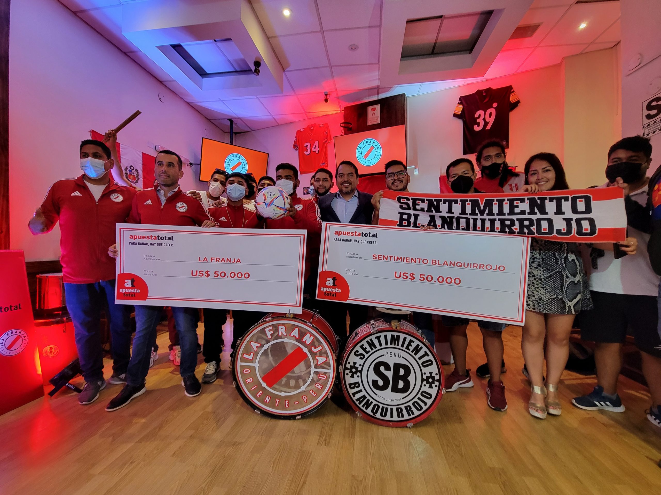 En conferencia de prensa, el CEO de Apuesta Total, Gonzalo Pérez, hizo entrega de dos cheques por 50,000 dólares: uno a nombre La Franja y otro a nombre de Sentimiento Blanquirrojo. Los fondos se utilizarán en su totalidad para que los integrantes de estas barras oficiales de Perú puedan financiar sus pasajes y estadía en la capital catarí.