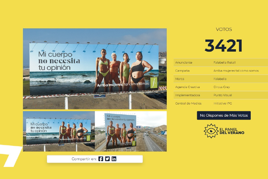 Y después de más de 10 días de votación, finalmente se ha revelado al ganador del «Mejor Panel del Sur 2024», siendo la marca Falabella quien se consagró con el título gracias a su campaña «Arriba mujeres tal como somos», la cual acumuló un total de 3,421 votos. Agregar que esta iniciativa fue desarrollada en colaboración con la reconocida agencia creativa Circus GREY, junto a la agencia de medios Initiative e implementada por Punto Visual.