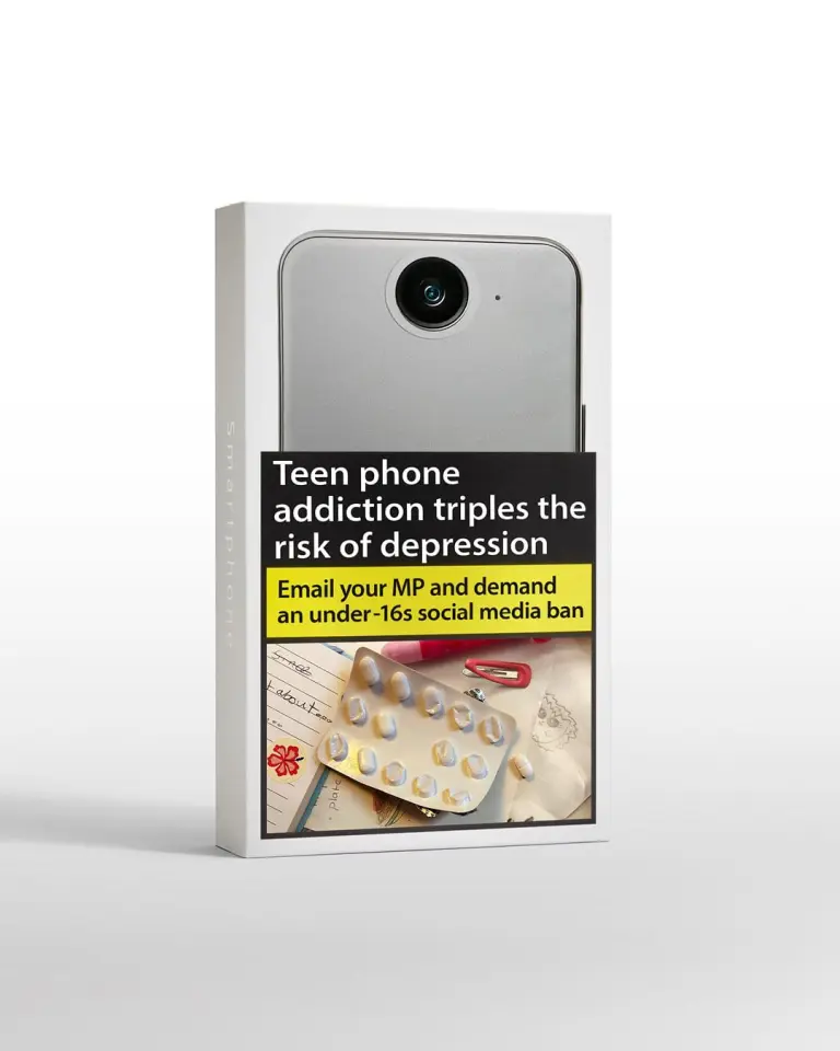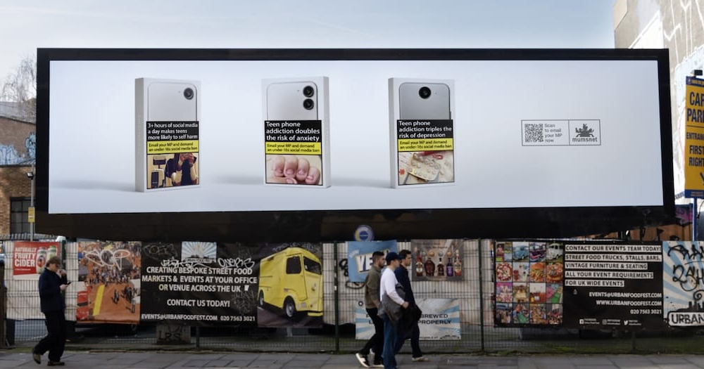 Siguiendo esa línea, el portal británico Mumsnet está desarrollando una campaña que pide prohibir acceso a redes a menores de 16 años replicando la publicidad de las cajas de cigarros. “Rage Against the Screen” reutiliza los códigos de dichos paquetes para mostrar advertencias sanitarias en las cajas de smartphones.