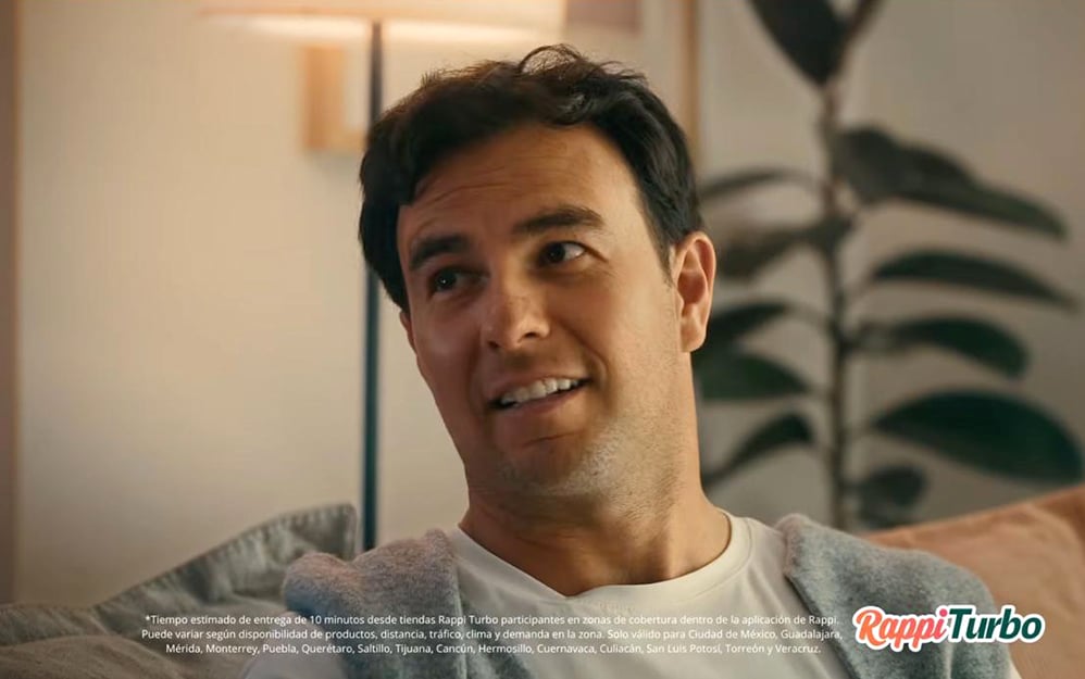 Aprovechando su reputación en la competición de alta velocidad, Pérez fue elegido para un anuncio de Rappi Turbo, el modelo de entrega ultrarrápida que garantiza productos de supermercado en menos de 10 minutos. Así, la compañía vincula velocidad, el mundo del deporte y la F1 con el consumo de snacks, bebidas y productos de conveniencia.