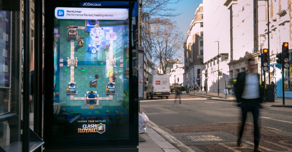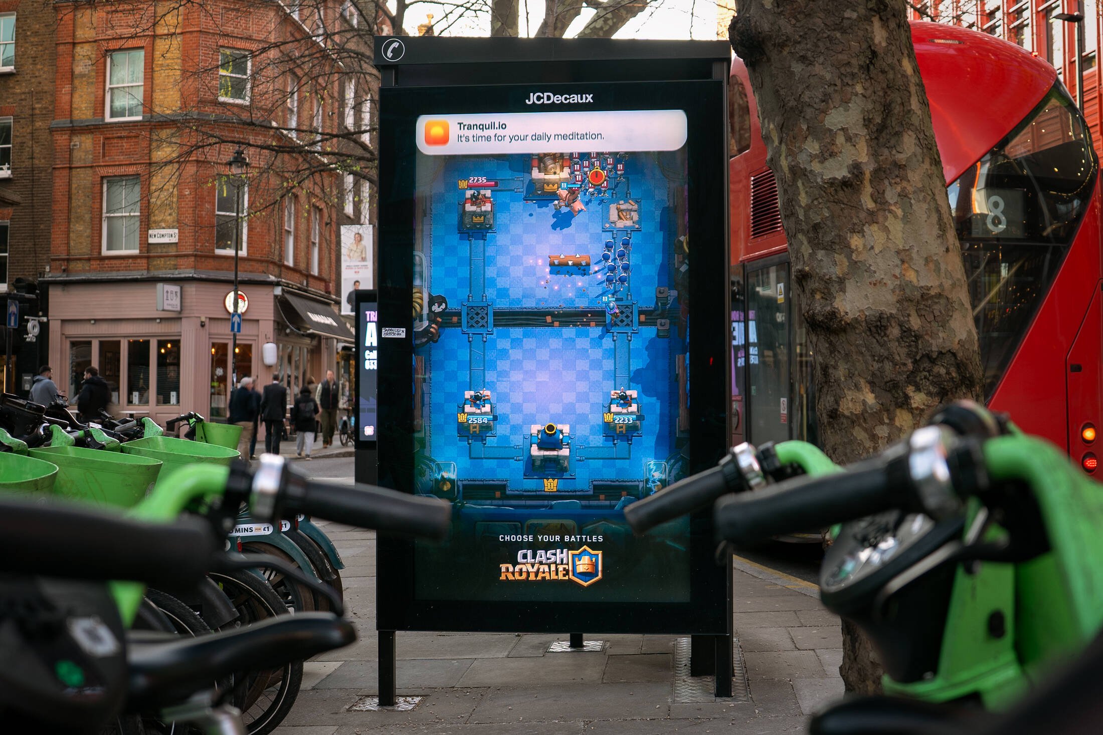 Para ello, ha desarrollado una serie de anuncios exteriores impactantes y contextuales en Europa, trabajados con la agencia DAVID New York. La publicidad muestra momentos de alta tensión del juego Clash Royale interrumpidos repentinamente por notificaciones de la vida real. Desde fechas límite de trabajo hasta mensajes románticos, dichas distracciones resaltan el sentido de la campaña.