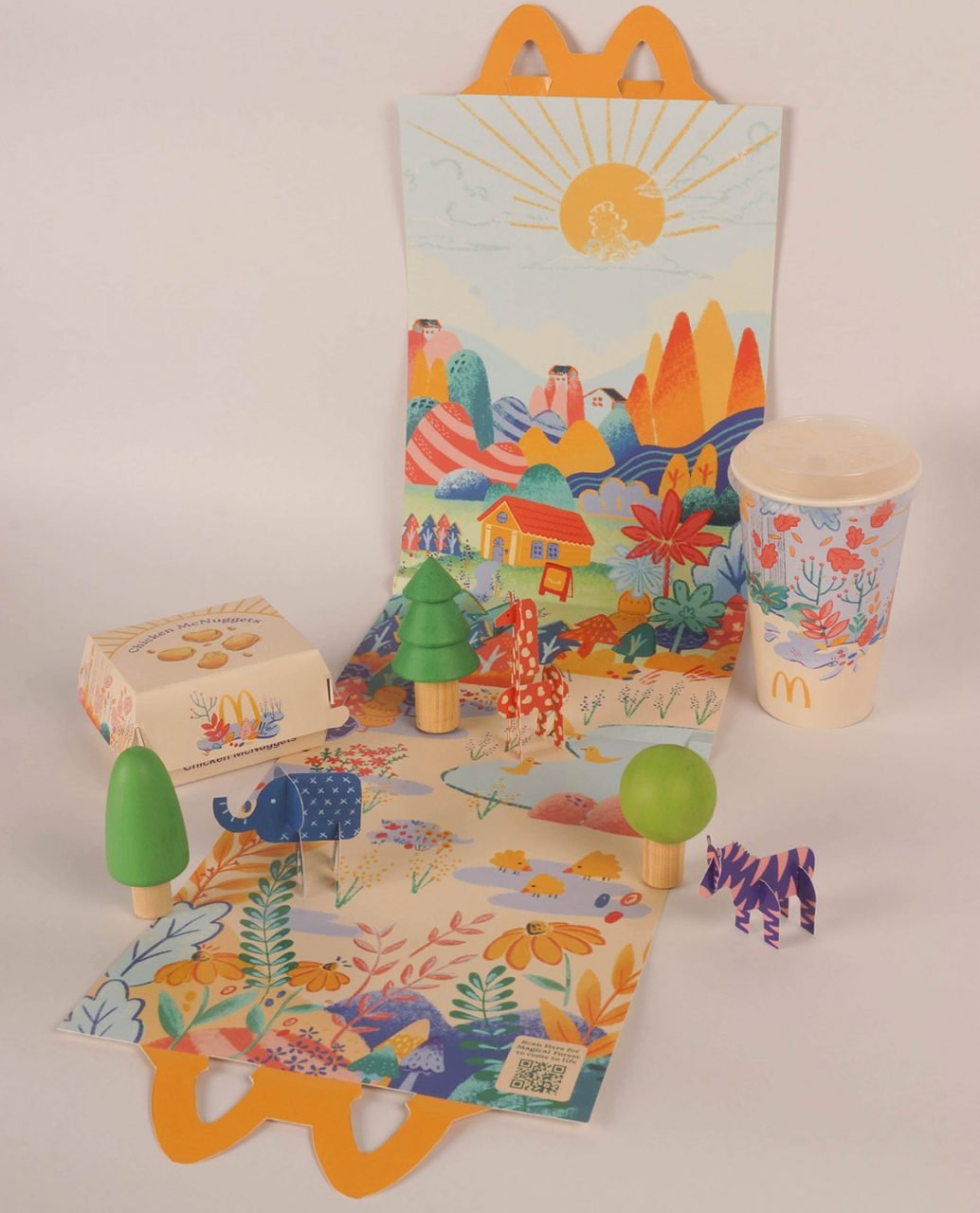 Junto a las hamburguesas y las papas fritas, el plástico es otro elemento tradicionalmente recurrente en las Happy Meal de McDonald ‘s. Dado el contexto de la crisis climática que vive el mundo actualmente, la diseñadora oriunda de Malasia Regina Lim se ha atrevido a reimaginar el empaque del menú infantil de franquicia, planteando de esta forma una propuesta más responsable.
