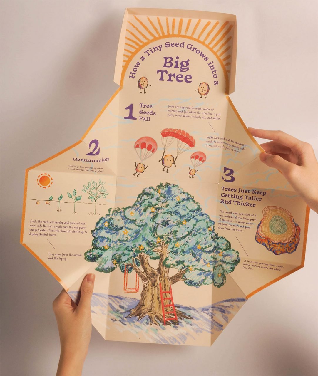 Así mismo, los juguetes que propone Regina Lim, son tres árboles de madera y cartones convenientemente recortados para que estos puedan transformarse a su vez en jirafas, elefantes y cebras de naturaleza tridimensional. De igual forma, cuando la caja del Happy Meal se desmonta, los niños encuentran en su interior la historia de cómo las semillas acaban convirtiéndose eventualmente en árboles.