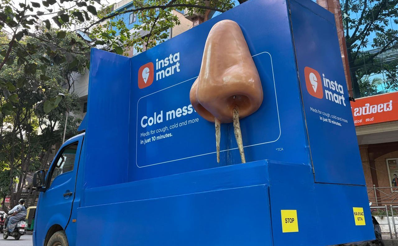 Se trata de un billboard móvil de la marca Swiggy bastante peculiar. La extravagancia radica en que decidió colocar una nariz de gran tamaño que aparenta estar goteando mucosidad, ¿el objetivo? pues destacar que pueden enviar medicinas de forma rápida para que las personas no pasen por eso.