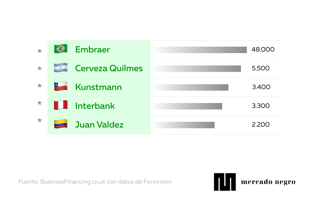 En Brasil, la empresa aeronáutica Embraer despunta como la peor pronunciada en dicho país con 48.000 escuchas. Mientras que, en Argentina, sorprendentemente Cerveza Quilmes es la que lidera (5.500).