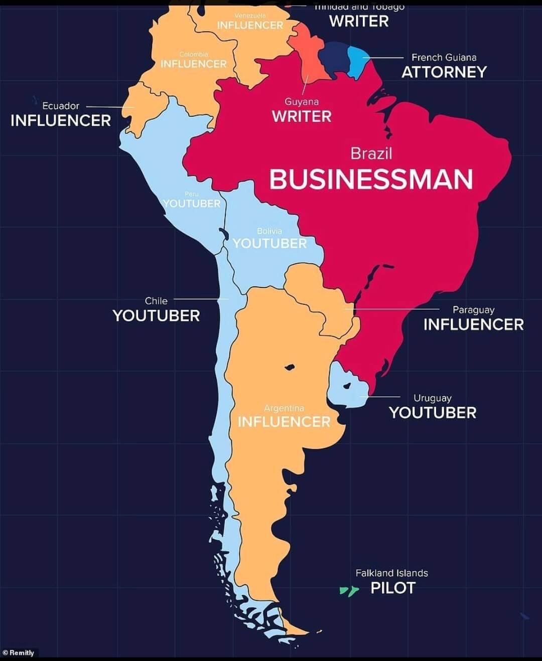 Entre los hallazgos de Remilty se encontró que en México, El Salvador, Perú, Bolivia, Chile y Uruguay los chicos quieren ser youtubers. En Argentina, Venezuela, Colombia, Ecuador, Paraguay, Costa Rica, Nicaragua y Honduras quieren ser influencers. Sólo en Brasil cambia el panorama, donde a los jóvenes les gustaría dedicarse a los negocios. Un resultado que no es de extrañar dado los sueldos que ofrecen plataformas como YouTube.