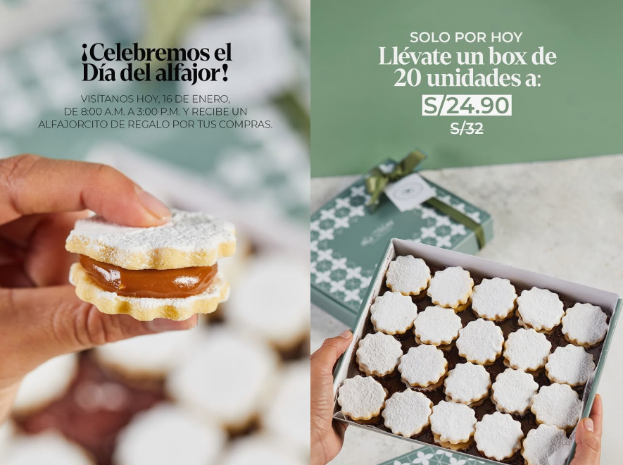 Por último, La Mora Pastelería alista la entrega de un minialfajor gratis por todas las compras. Adicionalmente, ofrece un box de 20 alfajores a 24.90 soles.