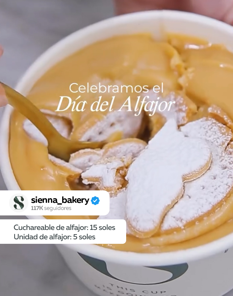 Sienna Bakery ha habilitado ofertas en los siguientes productos: cuchareable de alfajor a costar 15 soles; mientras que la unidad de alfajor, a 5 soles. Además, la marca va a regalar minialfajores a los primeros consumidores.
