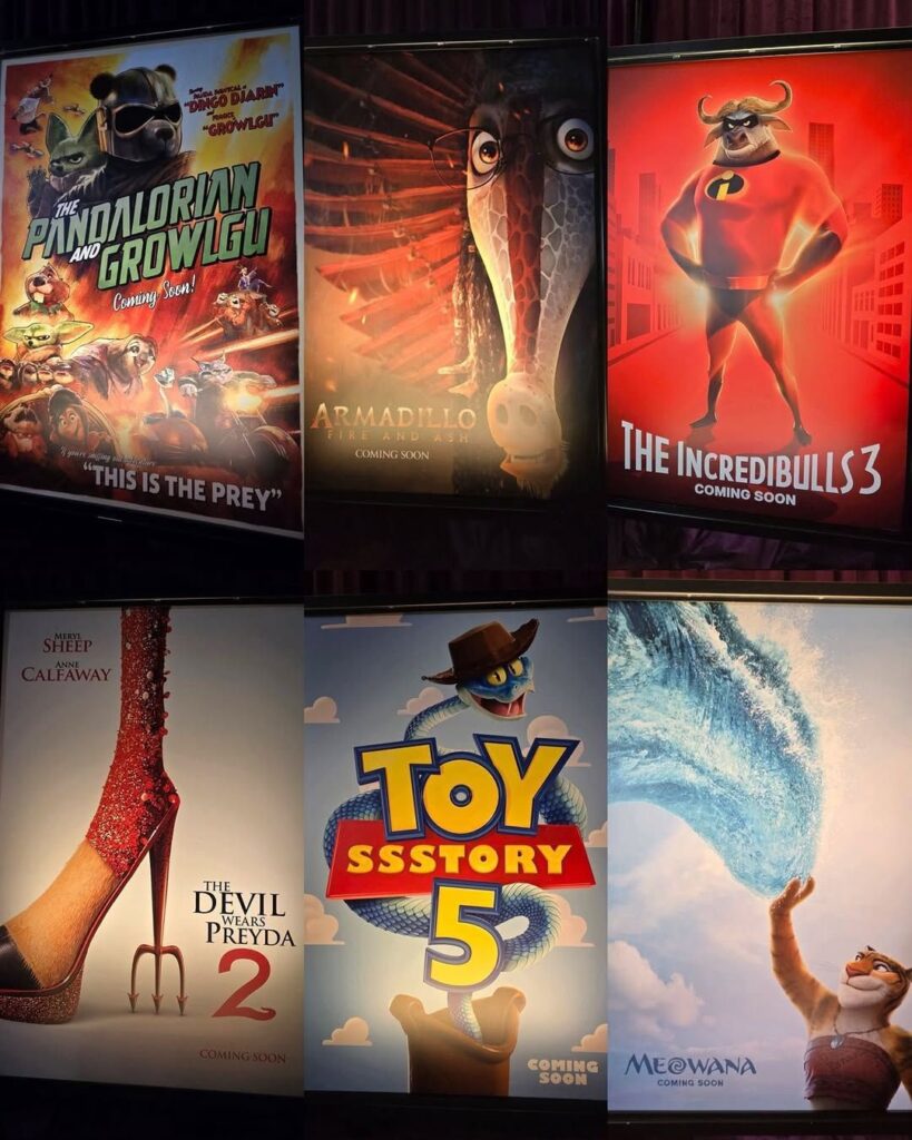 Lejos de tratarse de una promoción para las otras franquicias, todos estaban reimaginados para ser parte del universo de la película animada. Los invitados se encontraron con títulos como Armadillo: Fire and Ash (Avatar 3), The Pandalorian and Growlgu (The Mandalorian), The Devil Wears Preyda 2 (Devil Wears Prada), Zoo Story (Toy Story) y The Incredibeasts (The Incredibles).