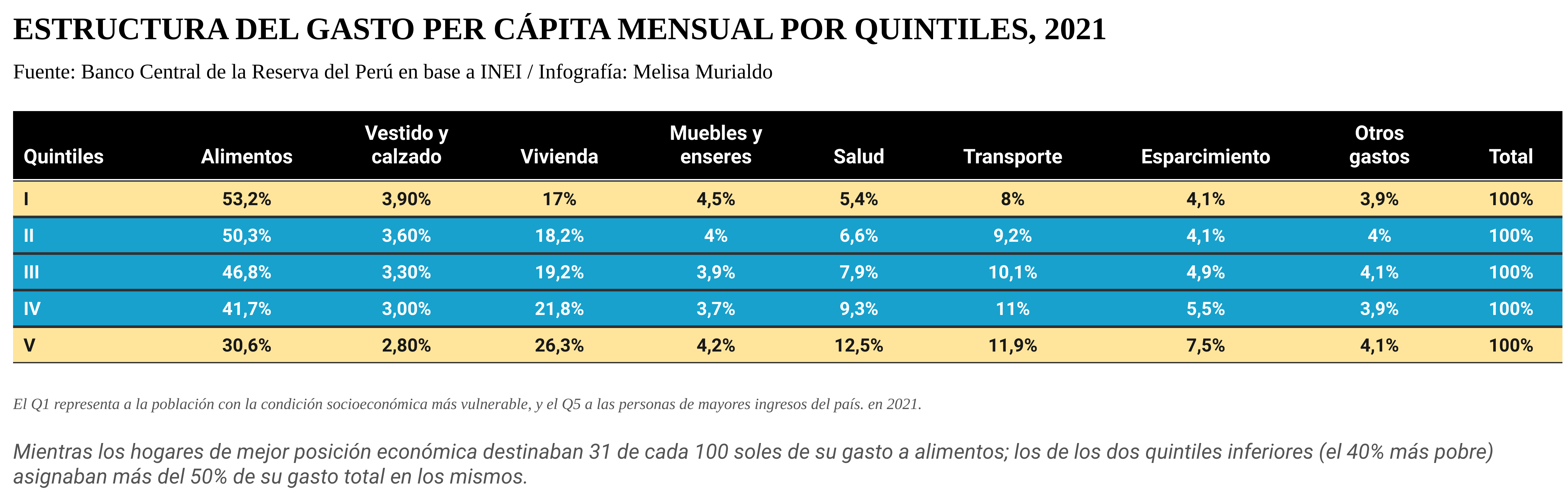 Los hogares con menos recursos experimentaron una contracción del 35% de sus ingresos durante la pandemia; en 2021, mientras los hogares de mejor posición económica destinaban 31 de cada 100 soles de su gasto a alimentos; los de los dos quintiles inferiores (el 40% más pobre) asignaban más de 50 de cada 100 soles.