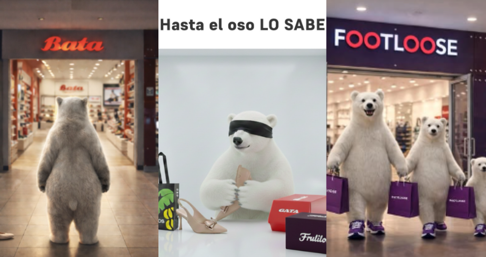 Footloose también se incorporó a la conversación y amplió el juego desde una lógica familiar y aspiracional. En su publicación, el oso polar aparece acompañado, recorriendo un centro comercial y saliendo de tienda con bolsas en mano, reforzando la idea de elección instintiva aplicada al consumo cotidiano.