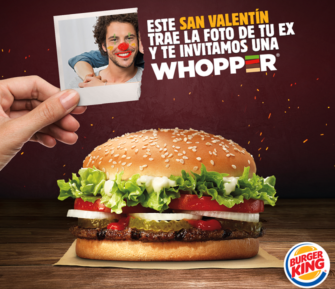 Burger King, siempre disruptivo, ha querido cambiar la dinámica de celebrar el amor este 14 de febrero. Al contrario de esos restaurantes que ofrecen promociones para dos, la cadena de Fast Food regalará hamburguesas a quienes se atrevan a llevar las fotos de sus exparejas a 10 de sus restaurantes.