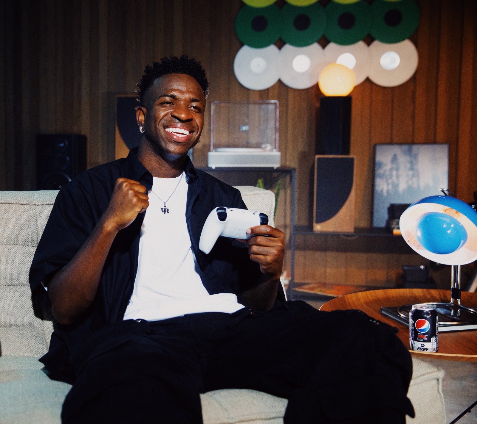 El anuncio muestra al jugador brasileño haciendo tiros contra la portería, antes de que la pelota se estrelle contra una máquina expendedora de Pepsi, dejando caer varias latas de edición limitada de Pepsi x EA SPORTS FC™ 24. El corto pasa entonces al avatar de Vini en el juego haciendo un gol sensacional; y culmina con Vini celebrando el gol contra un amigo en la comodidad de su casa.