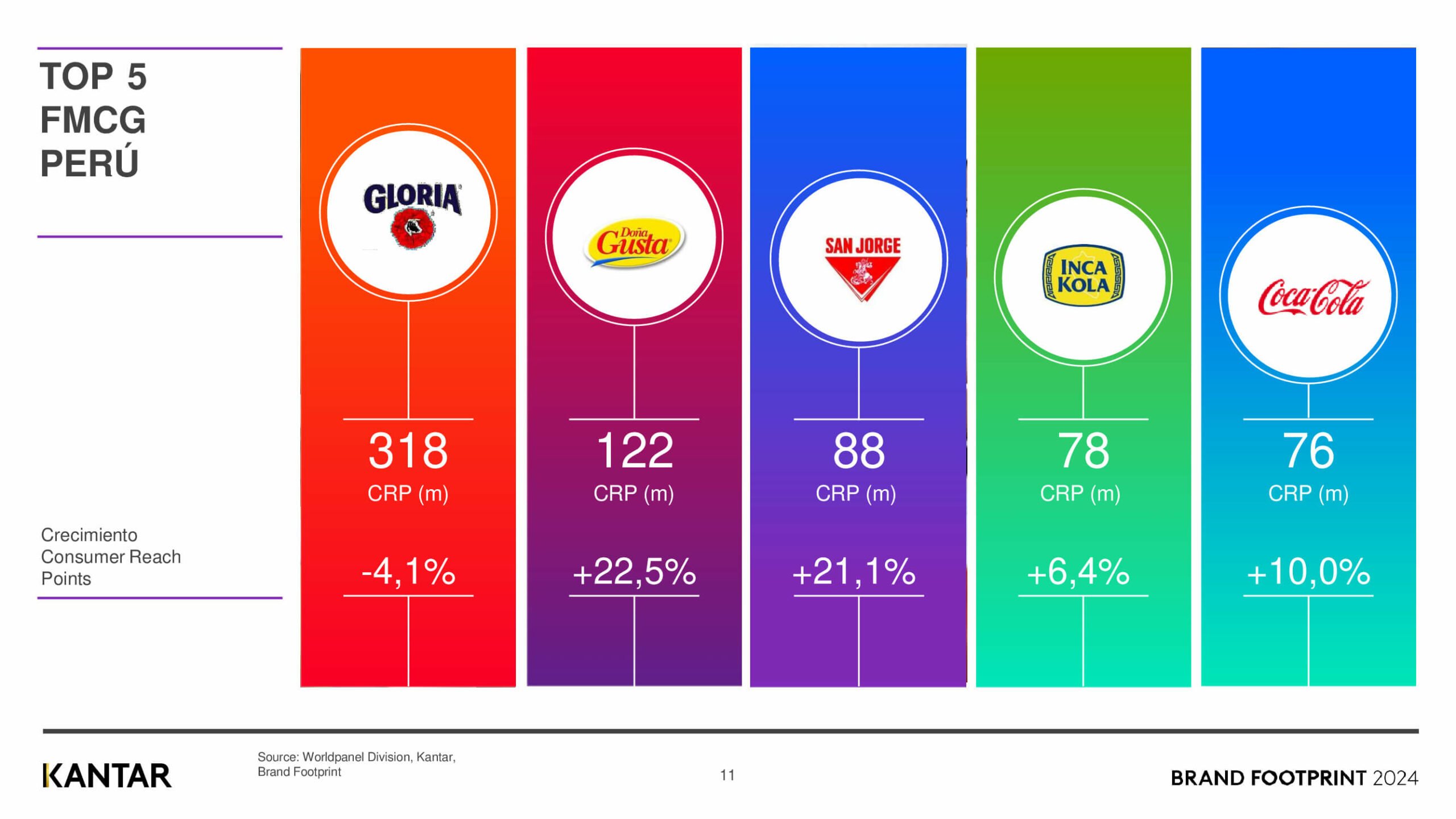 Por duodécimo año consecutivo, Kantar División Worldpanel Perú lanza una nueva edición del ranking Brand Footprint, que revela cuáles son las marcas de consumo masivo más elegidas por los hogares peruanos en el momento de la verdad: la compra. Este año destacan el ingreso de Coca Cola al top 5 y el ascenso de Inca Kola al puesto 4. Se mantienen en el podio como las marcas preferidas por los peruanos: Gloria (1); Doña Gusta (2); y San Jorge (3). En sexta posición está Bolívar, seguida de Ajino Moto, San Fernando, Sapolio y Molitalia (repite en cierre del top 10).