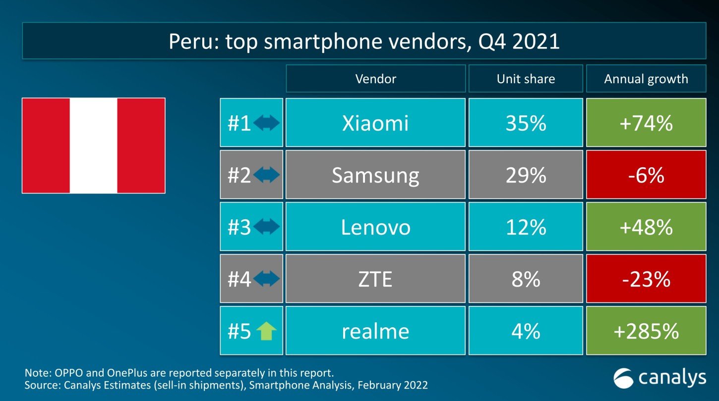 “No sería de extrañar que esté apuntalando su posición en el mercado peruano, teniendo en cuenta que tuvo un crecimiento del 130% en el cuarto trimestre, comparándolo con el trimestre anterior, del 748% comparando la totalidad de smartphones enviados en 2020 con 2021 y que sigue sumando smartphones a su portafolio en Perú”, agrega la nalista.
