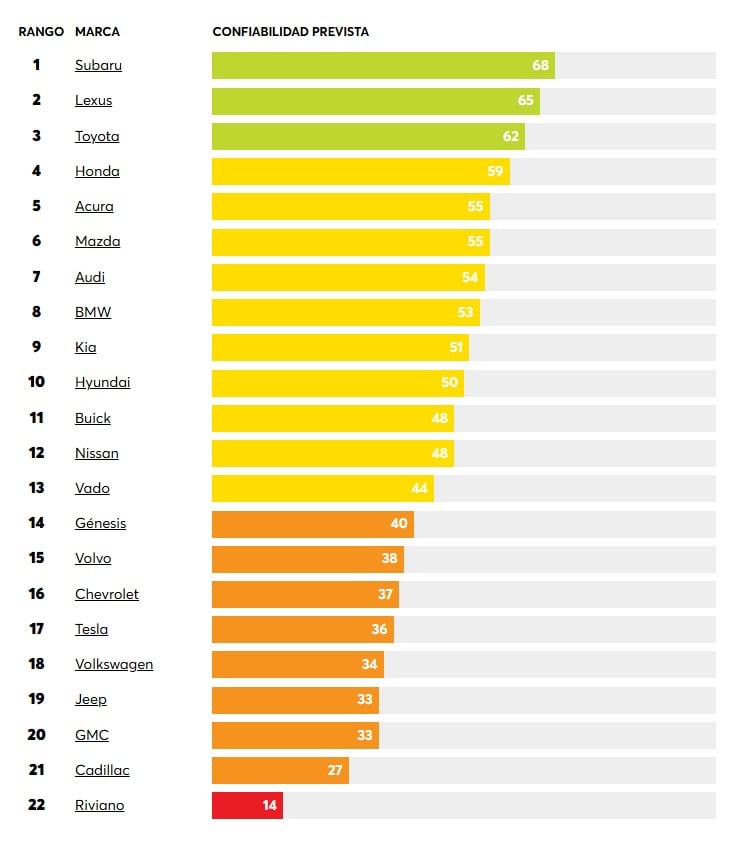 Los fabricantes asiáticos siguen dominando en fiabilidad, con ocho de las diez marcas más confiables. Las europeas ocupan el segundo lugar, mientras que las estadounidenses, con excepciones como Buick, quedan rezagadas.