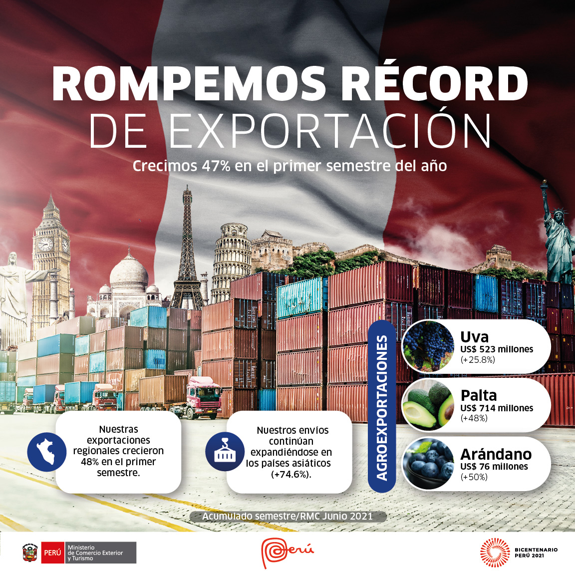 El ministro de Comercio Exterior y Turismo, Roberto Sánchez, informó recientemente que, durante el primer semestre del 2021, las exportaciones peruanas rompieron un hito histórico este año, y justo a tiempo para el bicentenario. Las cifras alcanzaron los US$ 24 439 millones, lo cual constituye 47% más al monto alcanzado en el mismo periodo del 2020, y el más alto comparado con todos los registros de los primeros semestres antes de la pandemia.