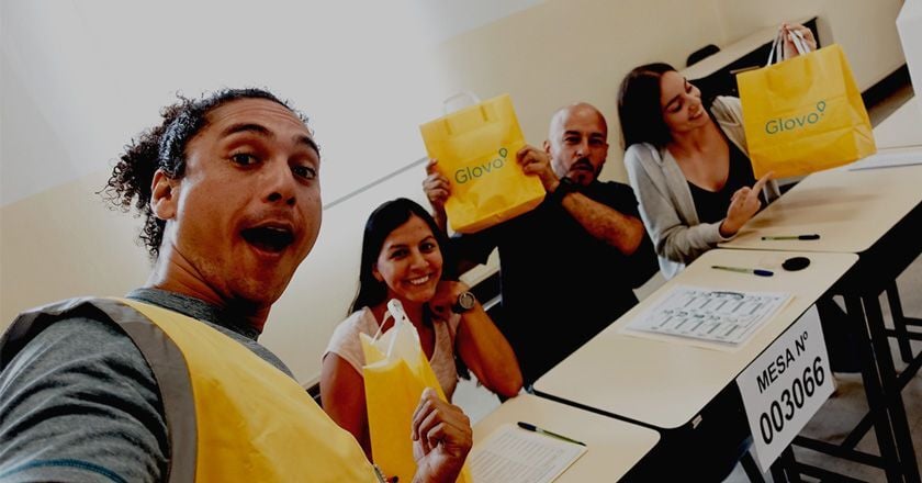 En un vídeo difundido por Glovo, se ve ingresar a un carismático repartidor de Glovo, con maleta en hombros, a uno de los centros de votación que recibe mayor cantidad de electores. En medio de miradas atónitas, de cansancio y hambre, este les entrega un combo de hamburguesas, papas fritas y demás aperitivos.