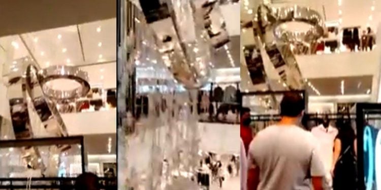 Lo que más sorprendió a los usuarios en plataformas digitales tras el incidente, fue cómo los clientes seguían comprando sin atemorizarse por el candelabro central de la tienda, mismo que se desprendió parcialmente y quedó colgando de un solo lado.