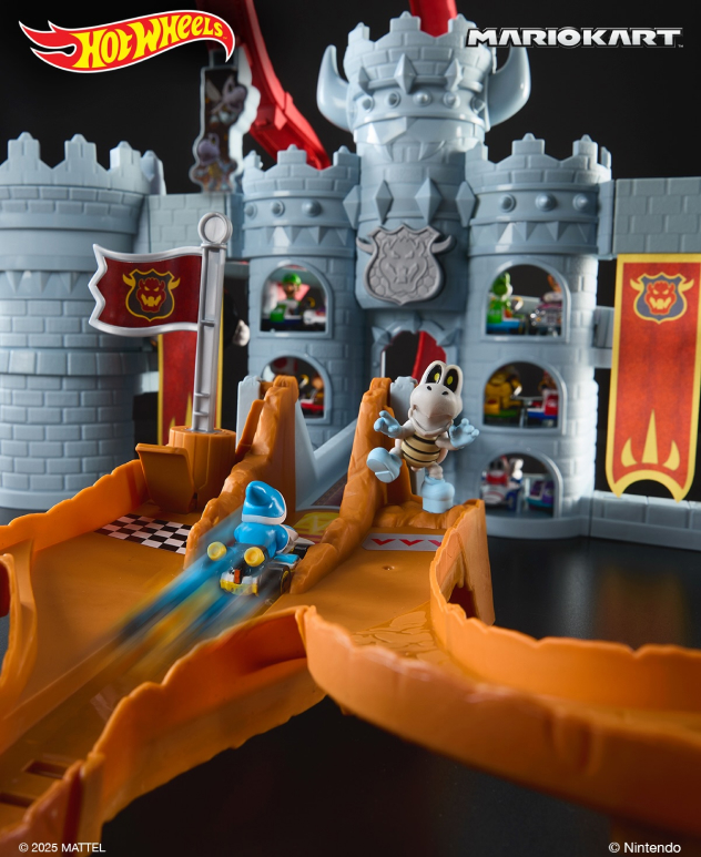 En ese sentido, Hot Wheels y Mario Kart transforman el castillo de Bowser en una pista de carreras real con un set que recrea uno de los escenarios más emblemáticos del juego. El circuito tiene paisajes volcánicos, curvas cerradas y una imponente estructura que evoca a las carreras más caóticas de la serie de videojuegos.