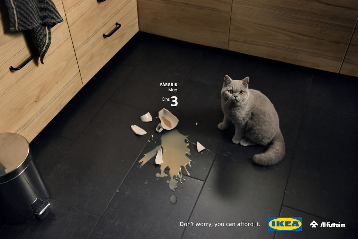 En cada caso, el anuncio muestra el bajo precio del producto y tranquiliza a los espectadores: «No te preocupes, puedes permitírtelo». El objetivo de la campaña no es solo decir que los consumidores pueden permitirse los desastres que generan las mascotas. También es dar a conocer las opciones asequibles del catálogo de Ikea. La marca medirá el éxito a través de las ventas de sus populares productos de bajo presupuesto.