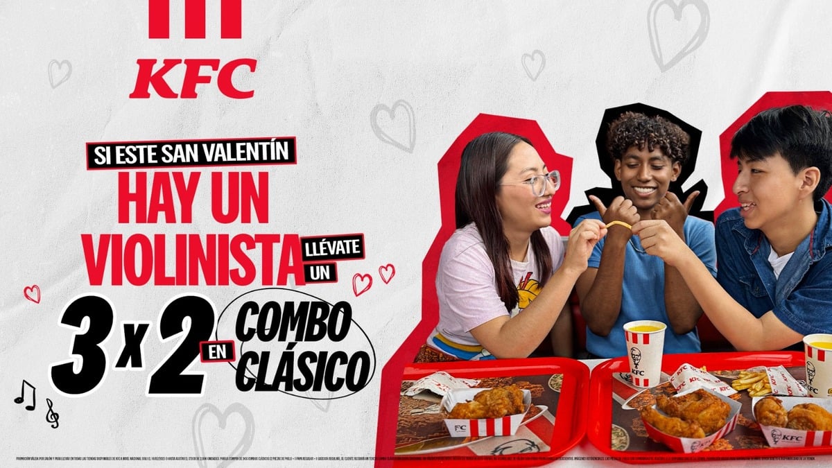 Para disfrutar de esta oferta, las parejas solo deben visitar cualquier tienda de KFC a nivel nacional y solicitar la promoción 3×2 del combo clásico. «Porque si el amor es de dos, el pollo puede ser para tres», destaca KFC.
