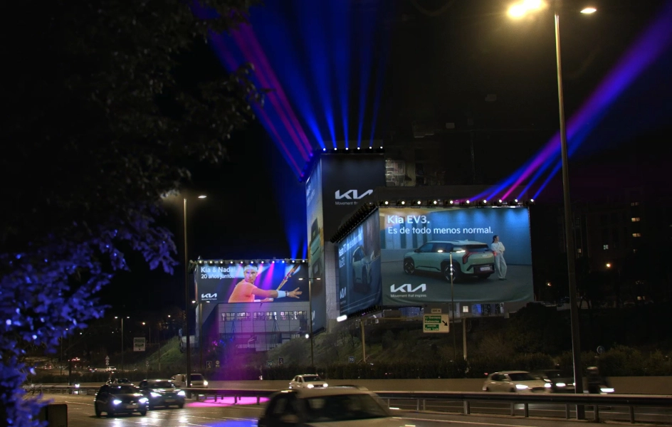 En opinión de Alfredo Guerra, director de marketing de Kia Iberia, “estamos en plena campaña de lanzamiento de un modelo 100% eléctrico pensado para un público objetivo mucho más amplio que en otras ocasiones, gracias a un precio realmente rompedor. Si el objetivo principal de esta pieza de exterior era impactar, pero te encuentras con que, al estar situada en un único emplazamiento, el número de personas que pasan por delante era limitado, ¿cómo podíamos amplificar la gran inversión que supone la colocación de unas lonas tan grandes y costosas?”.