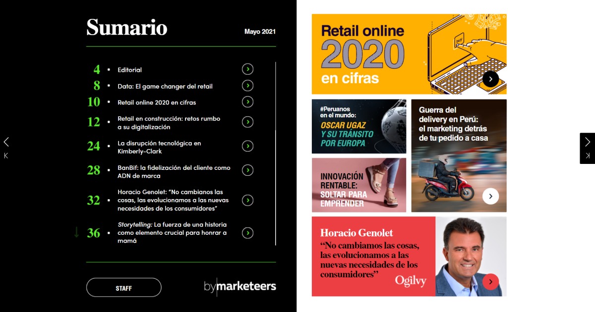 Entre sus páginas también se encontrará contenido exclusivo sobre las innovaciones y lanzamientos de marcas líderes en Perú: BanBif, Scotiabank, Kimberly-Clark, Entel, Levis, plazaVea y Backus con su nueva cerveza Pacifico. Así como un trabajo infográfico sobre el Crecimiento Retail 2020 en cifras, y una profunda investigación acerca de El Marketing detrás de tu pedido en casa: Rappi, PedidosYa y Fazil.
