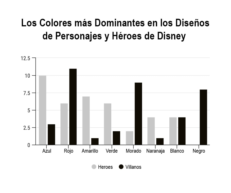 El estudio se basó en 40 héroes y 40 villanos de Disney. Como primer resultado se observó que el rojo se empleó más en villanos y el azul en héroes. Por otro lado, los colores oscuros como morado y negro prevalecieron en el diseño de los villanos. Mientras que los colores más brillantes como naranja y amarillo pertenecen a los héroes.