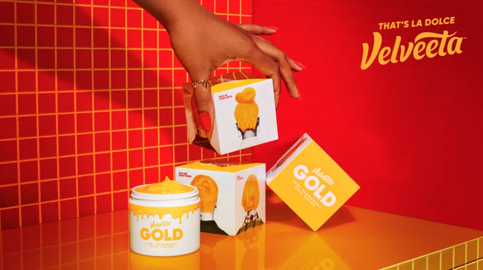 Se trata del primer tinte para el cabello lanzado por la marca, que permite a los consumidores lucir el distintivo color amarillo anaranjado de Velveeta en sus cabezas. Este tinte semipermanente está disponible en un tarro de cuatro onzas por 7,50 dólares, el mismo precio que una barra de queso Velveeta, y se puede adquirir en Amazon.com.
