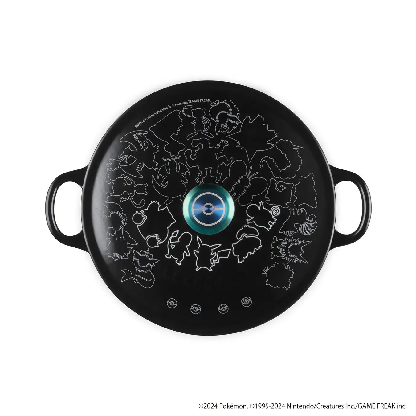 La colección incluye productos icónicos de Le Creuset con diseño de Pokémon, como una olla Cocotte amarilla con la cola de Pikachu y una olla Marmite negra con contornos de Charmander, Squirtle y Bulbasaur en la tapa. La base de la tetera amarilla muestra siluetas de Pikachu corriendo.