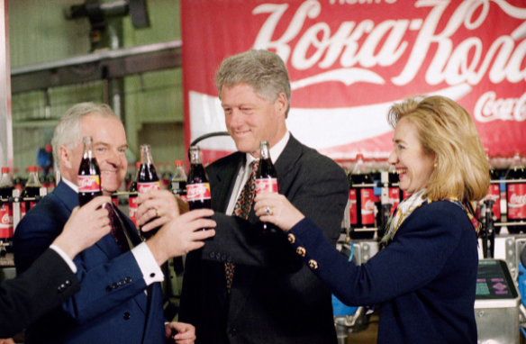 No fue hasta 1990 que Coca Cola ingresó a Rusia. Cinco años después, el entonces presidente de Estados Unidos, Bill Clinton, y su esposa hicieron todo lo posible para anunciar la marca en Rusia. En medio de esta campaña se tomó una fotografía en Moscú el 11 de mayo de 1995.