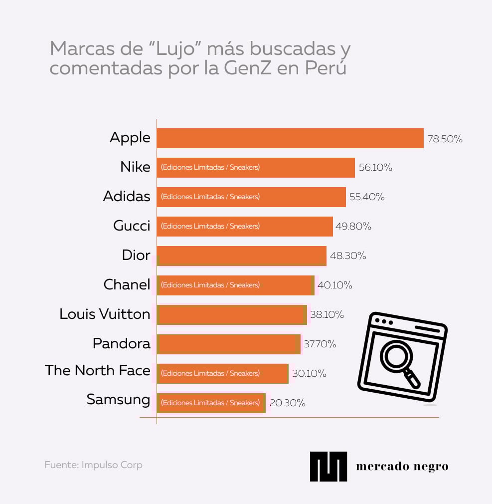 De acuerdo a un estudio realizado por la Unidad de Inteligencia de Datos de Impulso Corp, en el Perú más de 8 millones de personas (de entre 15 y 27 años) tienen acceso a internet. En este grupo de jóvenes, 4.4 millones se mantienen interactuando y buscando marcas de lujo, siendo un 62% provenientes de Lima, seguidos por Arequipa (8%), Trujillo (6%) y Cajamarca (5.4%).