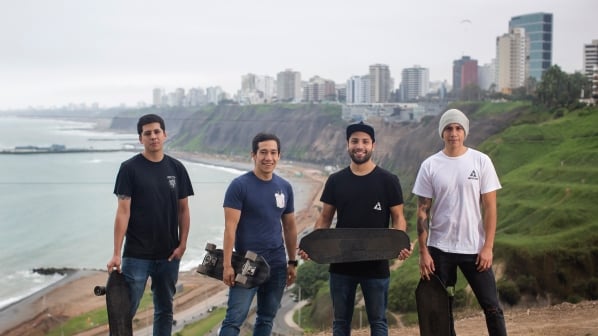 Javier Kanashiro, Mario Spelucin, Julio La Torre y Franco Trujillo, cuatro jóvenes apasionados por el surf, el skate y la protección del medio ambiente, han desarrollado skateboards con 60% de plástico de batería de autos y 40% de chapas de plástico.