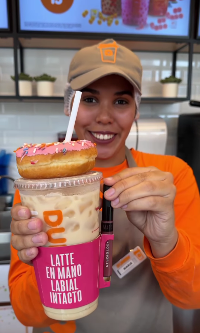 Otra marca que también ha decidido apostar por este tipo de colab es Cyzone. En su objetivo de que conozcan la efectividad de su labial mate (con 24 horas de duración y 0 transfer) se unió a la cafetería, lanzando una promo en la que por comprar una bebida o dona lo obsequian.