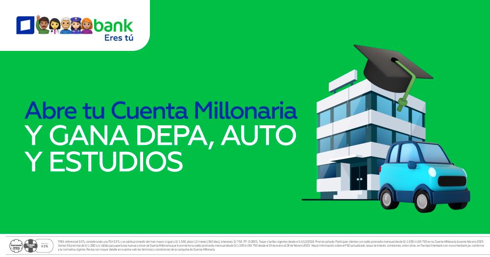 Interbank premia a sus clientes durante todo el año y reafirma su compromiso de apoyarlos en sus sueños, ya sea una vivienda propia, el auto que tanto querían o los estudios para seguir creciendo, mientras ahorran con la Cuenta Millonaria. A través de esta cuenta de ahorros, el banco sortea 4 veces al año un depa+un auto+estudios a un solo ganador a través de un sorteo transmitido en su fanpage de Facebook.