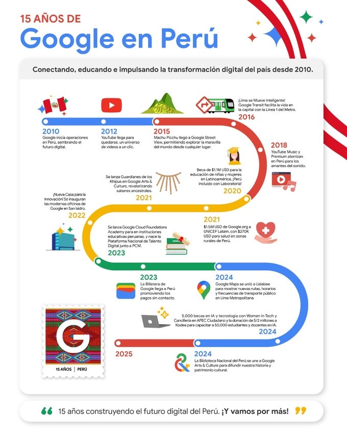 - 2024: Google otorgó 5,000 becas en Perú para cursos de IA y habilidades digitales, en alianza con Women in Tech y APEC. Además, Google Maps se unió a Ualabee para brindar datos precisos de transporte público en toda Lima Metropolitana. Y, en noviembre, Google donó S/2 millones para capacitar en IA y lanzó la colección de la BNP en Google Arts & Culture.