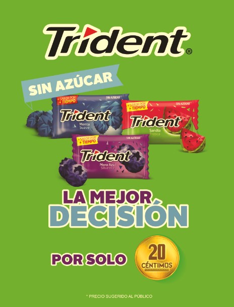 La presentación individual de Trident actualmente está comunicando su campaña de lanzamiento denominada “La Mejor Decisión”, la cual, cuenta con los siguientes apoyos: TV abierta, digital, exteriores y punto de venta.
